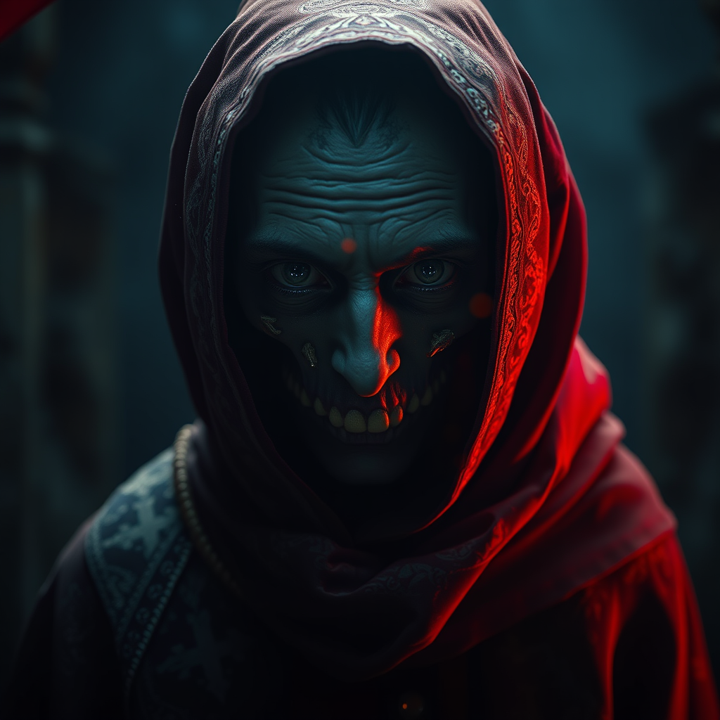 A hyper-realistic figure emerges from the shadowy depths of a dark kingdom, with eyes large and brimming with horror. Their clothing is saturated with intricate orthodox symbolism, each thread weaving a story of ancient traditions and mystic beliefs. Captured with exquisite precision on a Hasselblad H4D 200MS Digital Camera, the shot employs the Mitakon Speedmaster 65mm f/1.4 XCD lens, enhanced by dramatic Fresnel lighting to emphasize depth and texture. In this chilling scene, the haunting gaze tells of untold fears and whispered secrets, while the elongated frame presents an ethereal elegance, shadows dancing over richly detailed attire.
