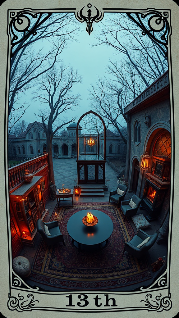 A hyper-realistic fisheye exterior image of a tarot card named "13th" in a gothic style, capturing an overlook of the scene with cinematic, indirect lighting, reminiscent of a Tim Burton film. The setting is styled with elements that fuse the elegance of AD magazine aesthetics with the architectural influences of Eames and Mies van der Rohe, creating a unique blend of whimsical and modern design.