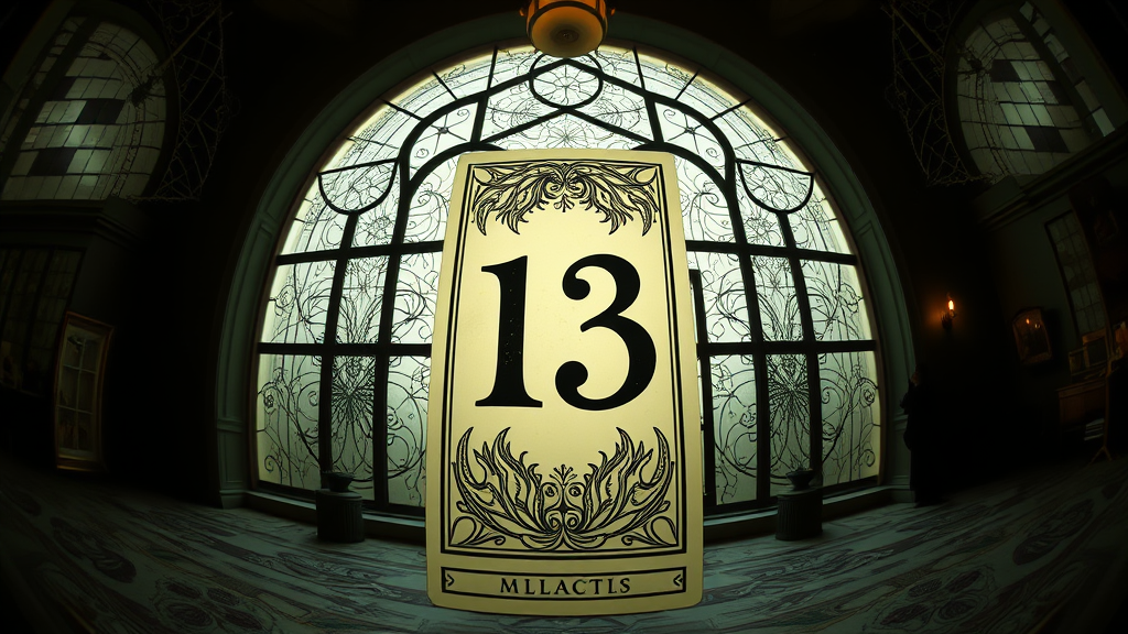 A hyper realistic fisheye exterior image of an original tarot card labeled "13th" captured in a gothic style. The scene captures a cinematic ambiance with soft, indirect lighting reminiscent of an AD magazine feature. The setting is infused with a Tim Burton-esque whimsical dark aesthetic, while elements of Eames' design and Mies van der Rohe's architectural elegance subtly inform the background.