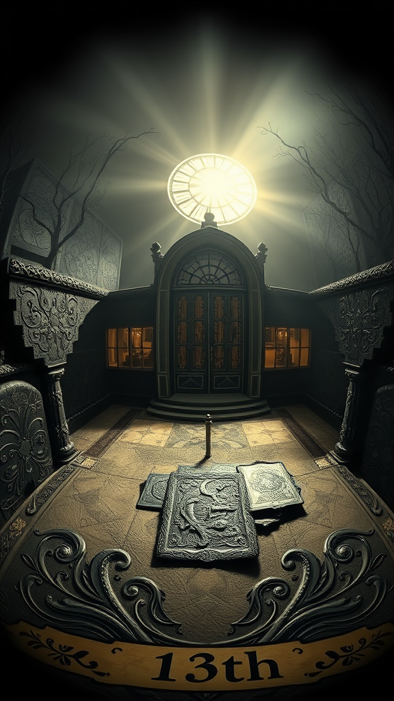 A hyper-realistic fisheye exterior photo of a "13th" tarot card in gothic style, overlooking a dramatic scene with cinematic and indirect lighting reminiscent of an AD magazine cover. The atmosphere echoes the whimsical, dark aesthetic of Tim Burton, combined with the sleek, modern lines of Eames and Mies van der Rohe. The scene is textured with intricate shadows and soft highlights, creating an enigmatic, alluring mood.