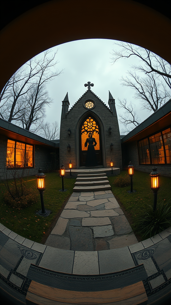 A hyper-realistic fisheye perspective of an exterior scene featuring a mysterious "13th" tarot card in a gothic style, casting an enigmatic presence over the landscape. The scene is illuminated with dramatic cinematic and indirect lighting akin to an Architectural Digest photoshoot, while evoking the whimsical and darkly enchanting essence of Tim Burton. The architectural elements blend influences from the sleek, modern elegance of Eames and Mies van der Rohe, providing a striking contrast between the mystical and the contemporary.