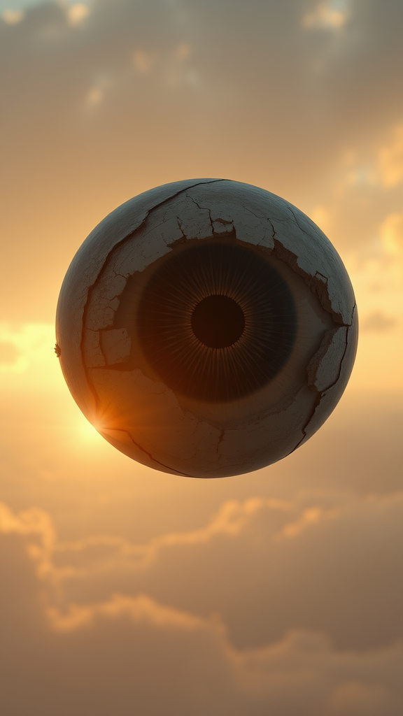 A hyper-realistic floating eyeball glides through the air, surrounded by dramatic pale sunrise light. Its surface shows signs of wear, with a texture that suggests it's weathered countless storms. The scene is captured from a low angle, offering a majestic view set against cinematic lighting that enhances the intricate details. This visual masterpiece, trending on ArtStation, could seamlessly belong to a Studio Ghibli narrative, combining the intricate artistry of John William Turner. Rendered in 4K with Unreal Engine 5, this visionary artwork captures every minute detail in a breathtaking, cinematic style.