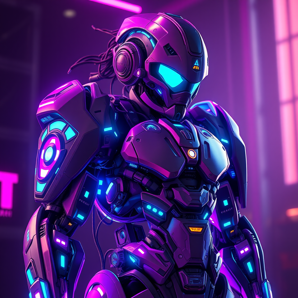 A hyper-realistic, full-body cyberpunk robot with complex purple and blue neon armor, featuring ornate details, set against cinematic lighting; the scene captures every intricacy in ultra-high definition, trending style on artstation, with the fine details meticulously rendered in 4k resolution, leveraging the power of Unreal Engine 5, delivering a vivid, cinematic experience with a focused and enhanced clarity.