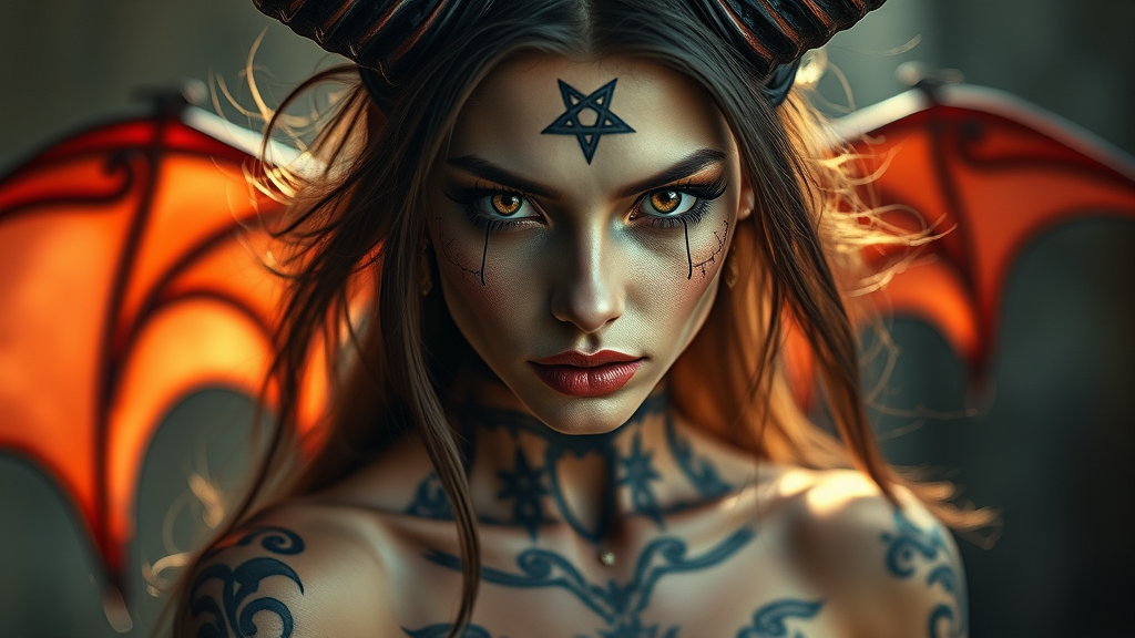 A hyper-realistic full body female demon, exuding an aura of enchanting beauty designed to captivate unsuspecting men. Her flawless skin is adorned with intricate witchcraft symbols, subtly tattooed to enhance her mysterious allure. Her eyes, filled with an intoxicating desire, lock intensely with the camera. Captured with exquisite detail using a Hasselblad H4D 200MS Digital Camera and a Mitakon Speedmaster 65mm f/1.4 XCD lens, the image radiates an ethereal glow. Her long, flowing hair cascades gracefully around her shoulders, and she stands with an elegant posture, adding to her mesmerizing presence. Soft shadows and ambient light play across her form, emphasizing her enigmatic and seductive nature, as the photograph embraces a 1:2 aspect ratio and stunningly deep color saturation. Her beauty, both otherworldly and dangerous, is a testament to the power of allure and mystery.