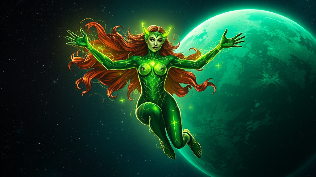 A hyper-realistic full body portrait of a celestial, god-like Poison Ivy character soaring through space, with vibrant neon green hues illuminating her figure. She is majestically poised in front of a vast, magical emerald planet, her strong features exuding divine power. Her attire is inspired by classical Poison Ivy aesthetics, enhanced with intricate vine-like patterns and glowing elements that shimmer in space's darkness. The scene is captured with extraordinary detail, evoking the clarity of a Hasselblad H4D 200MS Digital Camera paired with a Mitakon Speedmaster 65mm f/1.4 XCD lens. Subtle Fresnel lighting emphasizes the rich, glowing greens and adds depth to the cosmic backdrop, creating a dynamic and otherworldly atmosphere.