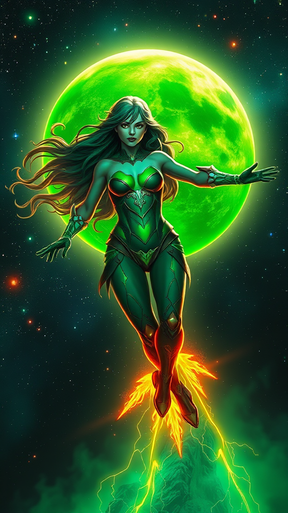 A hyper-realistic full body portrait of a game character resembling a celestial version of Poison Ivy, depicted with an ethereal presence as she effortlessly glides through the cosmos. Her powerful features exude divine strength as she floats in front of an enchanting green planet, her attire reminiscent of Poison Ivy, but imbued with godlike enhancements. The scene is bathed in space-themed colors, dominated by shades of neon and glow-in-the-dark greens, creating an otherworldly ambiance. The image is hyper-detailed, captured with the precision of a Hasselblad H4D 200MS Digital Camera paired with a Mitakon Speedmaster 65mm f/1.4 XCD lens. The composition is intensified with Fresnel lighting, accentuating the divine radiance and intricate details that characterize this cosmic goddess.