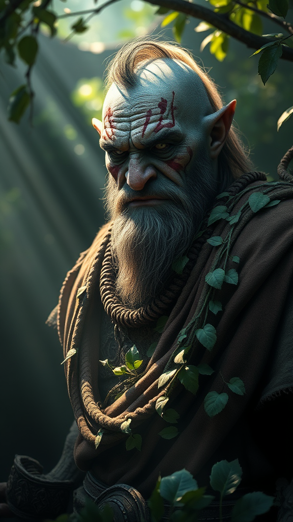 A hyper-realistic full-body portrait of a male orc druid, bathed in dramatic light, with a touch of light mist swirling around. The scene is highly detailed, capturing every wrinkle and texture on the orc's rugged skin, adorned with intricate tribal markings. His attire is woven with elements of nature, leaves and vines intertwining across his robes. The setting feels alive with a natural mysticism, the foliage around him gently swaying, hinting at a life force. This 4k rendering in Unreal Engine 5 brings out vibrant colors and deep contrasts, reflecting an inspired artistry reminiscent of John William Turner, evoking an ancient yet timeless presence.