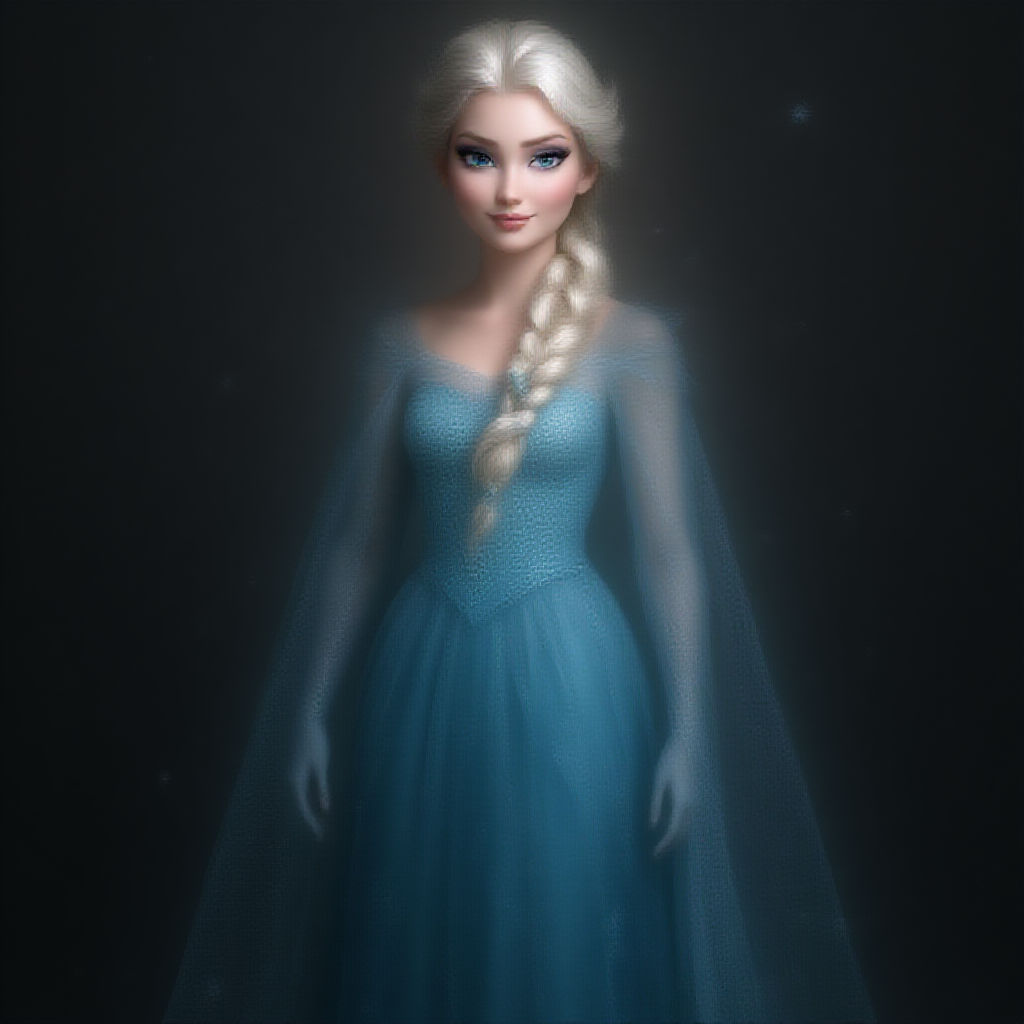 A hyper-realistic full-body portrait of Elsa from Frozen, with an emphasis on hyper-detailed and intricately detailed features. The image boasts sharp focus, capturing the highest quality with hard and foreboding lighting. The dynamic angle highlights her perfect form, showcasing highly detailed skin texture and a beautifully detailed face and eyes. The composition uses muted tones, emulating a professional photography style, embracing realistic hyperrealism, and capturing an UHD, HDR essence in 16k resolution. Subtle creative elements might include snowflakes gently swirling around her, adding an ethereal touch to the scene.