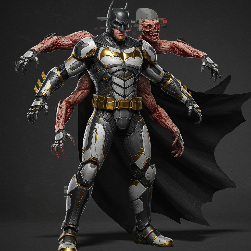 A hyper-realistic, full-body portrayal of Batman in a dynamic pose, showcasing an ultra-detailed armored suit with exquisite white and gold chrome accents contrasted against a matte black finish. The suit emanates luxury and power while maintaining a gritty aesthetic. Capture the character's essence with sharp 8K detail, ensuring the focus is on the intricate armor design. The composition is intentionally flawed with features like tiling textures, awkwardly drawn hands and feet, and a facial expression that's obscured or out of frame. The scene portrays Batman with extra limbs, conveying a sense of movement, though they appear disfigured or deformed, adding a surreal touch. The image includes blurred elements, intentional graininess, and visible jpeg artifacts, emphasizing a draft-like quality. The anatomy defies logic with poorly blended lines, strange body posture, and disproportionate aspects. Elements such as mismatched or cross-eyed gaze, or crooked facial expressions serve to enhance the avant-garde nature. Overall, the image creates a juxtaposition between photorealism and the chaotic abstraction of a purposely flawed composition.