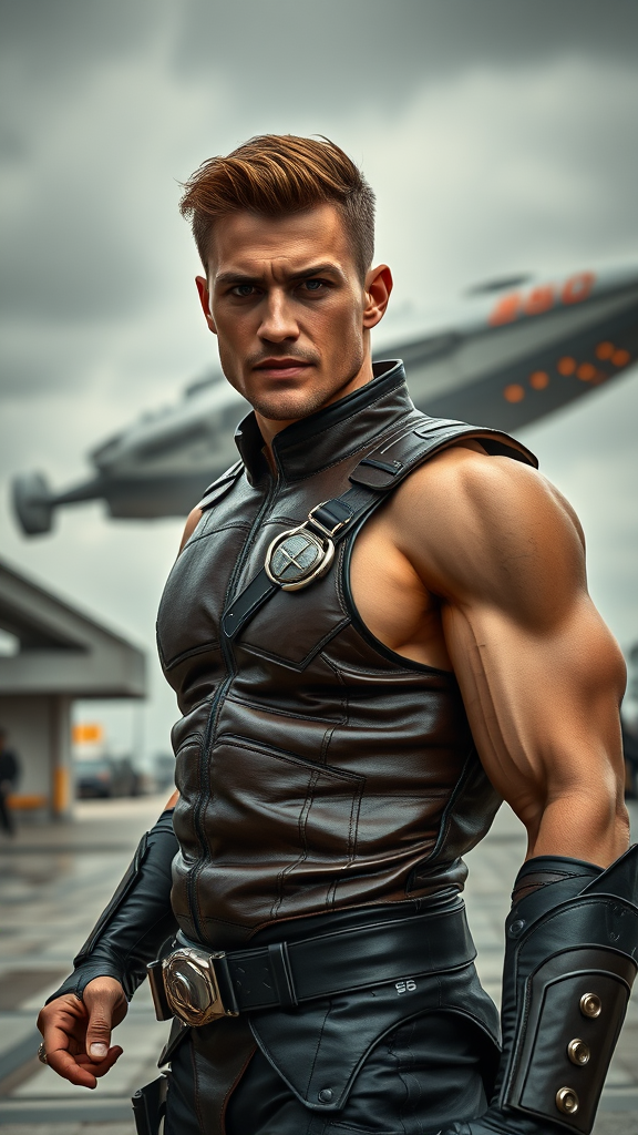 A hyper-realistic, full-length portrait of a 28-year-old Israeli Caucasian male with a commanding presence, showcasing a sculpted physique and natural charisma. The image captures the subject at a futuristic spaceport, where a sci-fi ship is taking off in the background, creating an epic and dynamic scene. He is clad in intricately detailed leather armor, highlighting every muscular contour, with shiny, perfectly styled hair adding to his confident aura. Cinematic lighting and natural textures emphasize the scene's vibrancy and realism, while an action pose suggests strength and dominance. The setting's moody, overcast atmosphere is enhanced by volumetric lighting, creating a dramatic and immersive experience. The portrait is rendered in stunning 8K Ultra-HD, utilizing advanced techniques like ray tracing for the highest level of detail and realism.