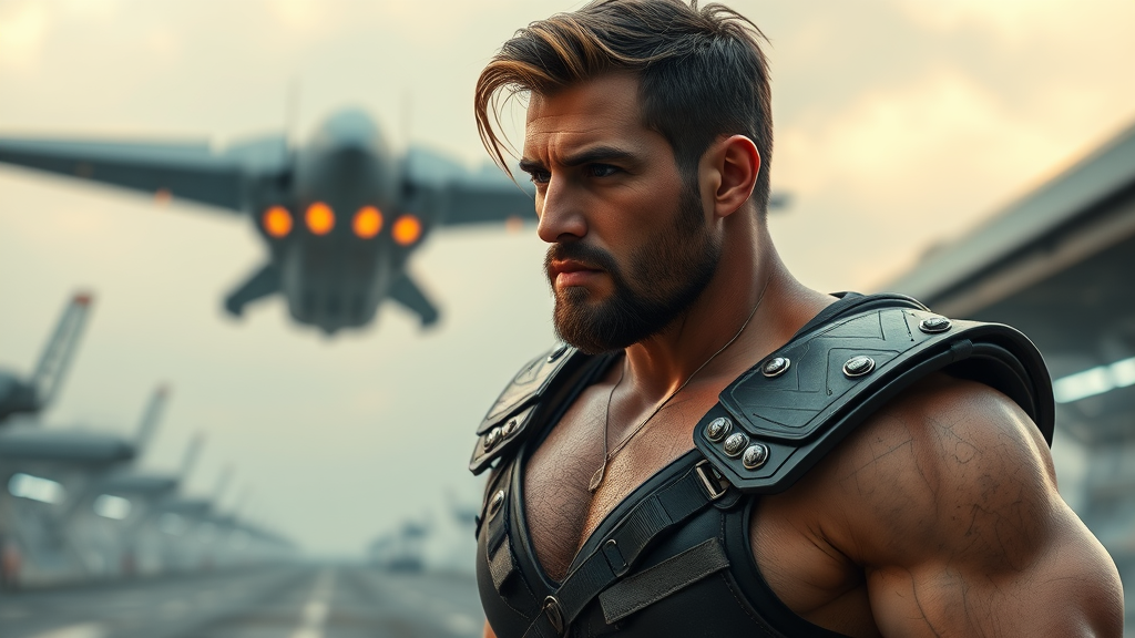 A hyper-realistic full-length portrait of a 28-year-old Israeli Caucasian male with a dominant presence. He has a powerful physique with defined muscles and a naturally hairy chest, complemented by shiny hair. The scene is set at a futuristic spaceport, featuring a sci-fi ship taking off in the background. He's wearing intricately detailed plate leather armor, with a light and voluminous atmospheric effect enhancing the moodiness of the setting. Captured in a cinematic style using natural and moody lighting, the image is rendered in 8K Ultra-HD for maximum detail and vibrant realism. The composition includes a blurred effect to emphasize the sense of motion and a long exposure for depth. The action pose conveys an epic and dynamic vibe, with attention to natural textures and ray-traced lighting adding to the photorealistic quality. The photograph avoids common errors such as poor anatomy, low resolution, and digital artifacts, ensuring the highest quality and pristine detail in a cinematic, movie-style presentation.