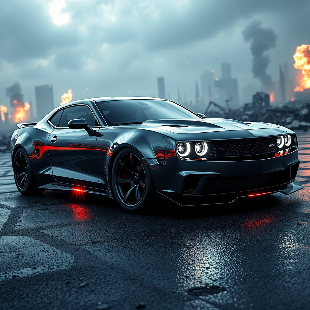 A hyper-realistic futuristic muscle car with a sleek, reflective aluminum body intertwined with matte black paint, casting brilliant beams from its bright headlights. The high-resolution image captures every subtle detail and highlights the carβs striking design against a dramatic backdrop of a city in ruins with sporadic explosions lighting up the skyline. The car exudes an intense feeling of speed, emphasized by its glowing accents and ultra-detailed finish, with ray-traced reflections mirroring the destruction around it. Specular lights dance across the surface, adding depth and texture, creating a dynamic scene from a side perspective.