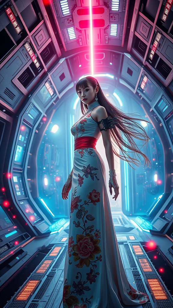 A hyper-realistic futuristic scene featuring a cyber-enhanced girl adorned with cyberpunk prosthetics, dressed in an elegant Chinese gown with flowing long hair. She stands inside a high-tech spaceship with a sleek, ultra-modern design. The atmosphere buzzes with sci-fi aesthetics and hyper-detailed elements. A radiant laser beam pierces through the center, seemingly connecting to another laser descending from the sky. Energy orbs pulse and dance around her, capturing the essence of acceleration and speed. The entire scene is bathed in dynamic light flashes, creating a profound sense of movement. The visual is akin to a cinematic painting with super resolution, showcasing a blend of photorealism and imaginative futurism, captured in 8K HD, with a dramatic long-exposure effect.
