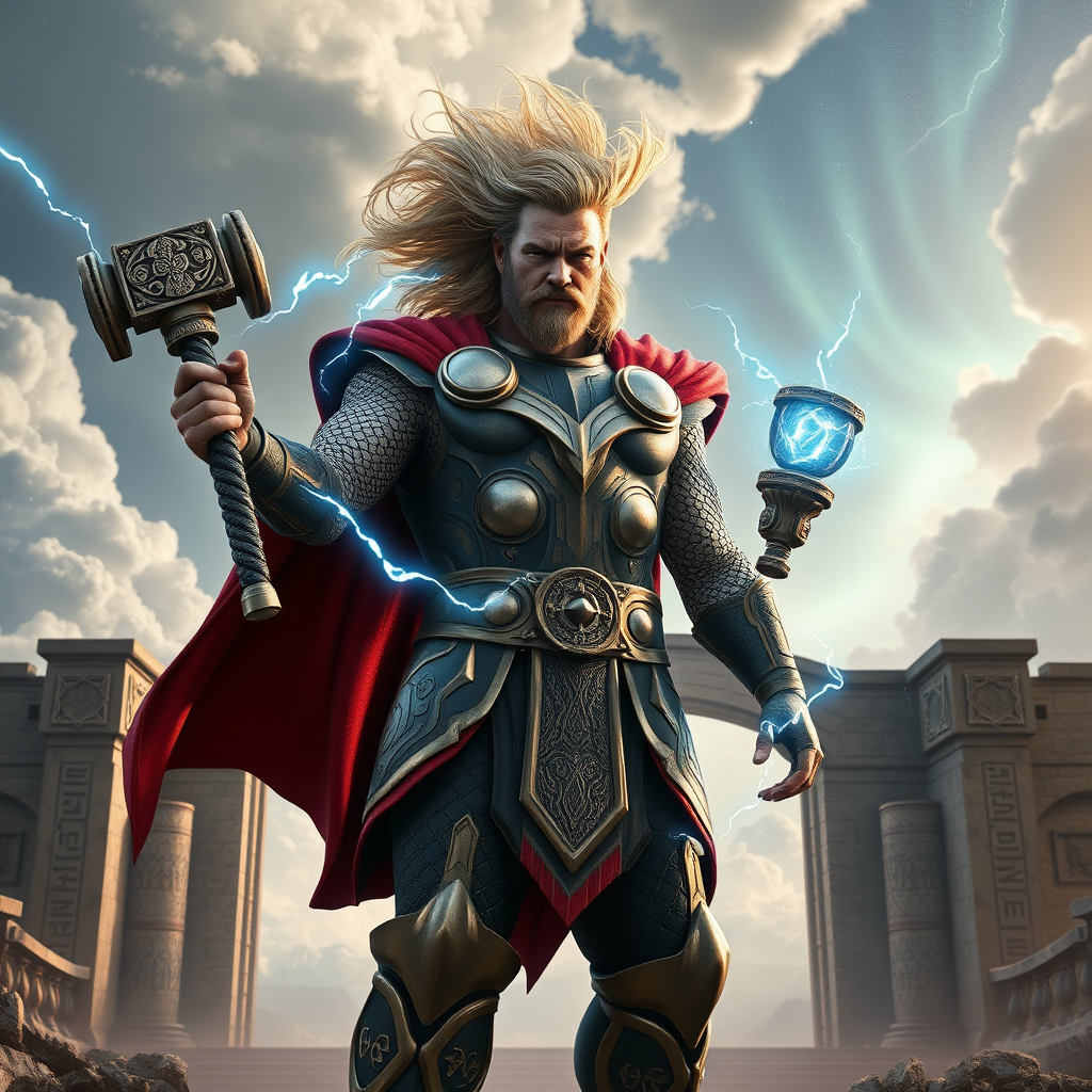 A hyper-realistic game character depiction of Thor, the God of Thunder, showcasing intricately detailed symbolic armor that tells the stories of Norse legends. He wields Mjölnir in his right hand, from which electric blue lightning bolts crackle and radiate powerfully. Thor stands resolutely at the majestic entrance of Valhalla, a grand gateway crafted from ancient stones and covered with mystical runes. His wind-swept hair and cape flow dynamically in the raging storm of energy surrounding him, framed by an epic, cloud-filled sky that accentuates his divine presence. In the background, celestial auroras dance across the horizon, highlighting the grandeur of this mythical realm.