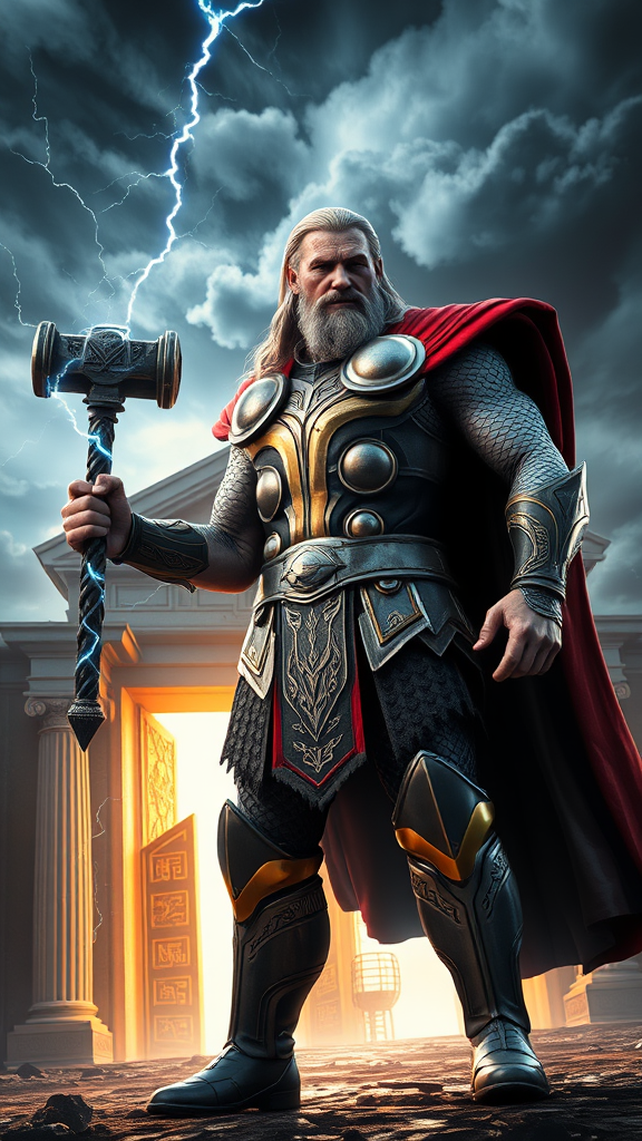 A hyper-realistic game character portrayal of Thor, the God of Thunder, with exquisitely detailed and intricately symbolic armor. He wields Mjölnir in his right hand, with arcs of electric blue lightning pulsating from his muscular form. Thor stands majestically at the entrance of Valhalla, an ethereal glow illuminating the grand, ancient gates behind him. The stormy skies above swirl ominously, casting a dramatic backdrop that contrasts with the golden hues of the divine monument. Norse runes are etched across his armor and weapon, telling epic tales of conquest and strength. Despite the intensity, his expression exudes both power and wisdom, embodying the quintessential god of thunder.
