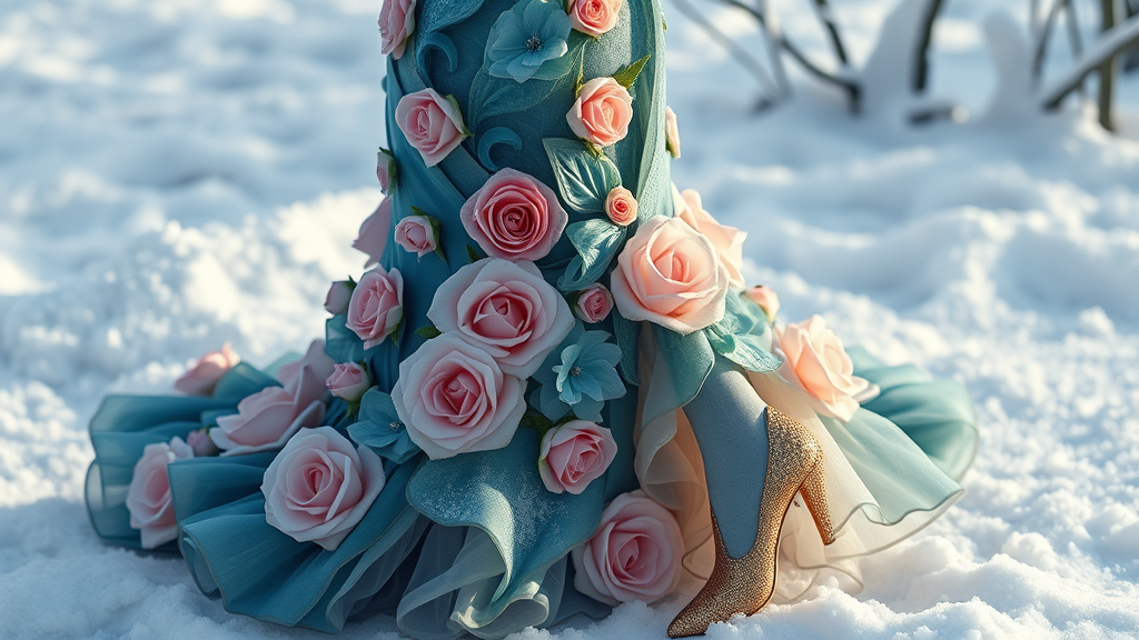 A hyper realistic haute couture dress blending elements of the ocean and blossoming roses, featuring elegant curvy silhouettes. Complementing the dress are gold gilded shoes adorned with lightning-inspired laces. The ensemble is set against a serene snowy background, with intricate details brought to life through octane render, adding depth and texture.