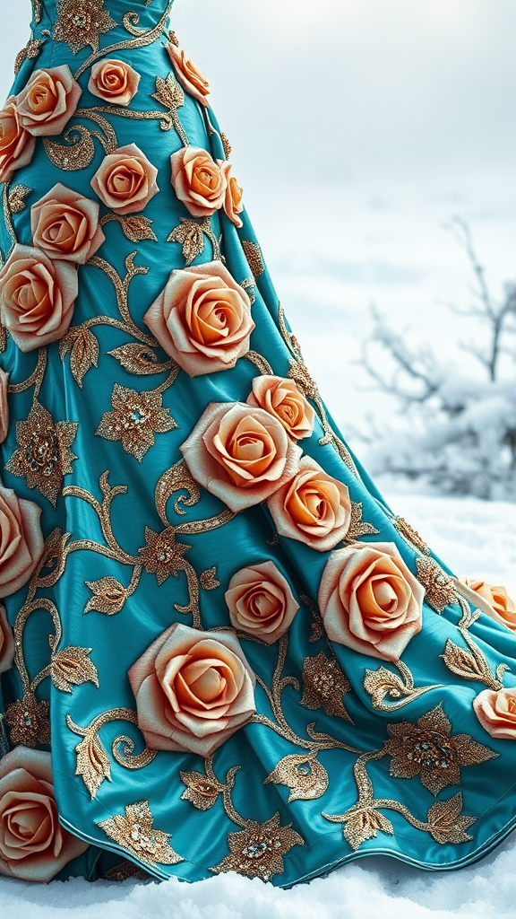 A hyper-realistic haute couture gown inspired by the sea and roses, featuring elegantly curvy silhouettes that mimic ocean waves interwoven with intricate rose patterns. The fabric shimmers with iridescent blue-green hues, embellished with delicate gold threadwork and sparkling sequins that catch the light. Gold gilded shoes with intricate lightning lace patterns complement the ensemble. The backdrop is a snowy landscape, where the contrast of chilly whites enhances the opulence of the design, while gentle snowflakes subtly reflect off the gown's surfaces, adding a touch of ethereal beauty.