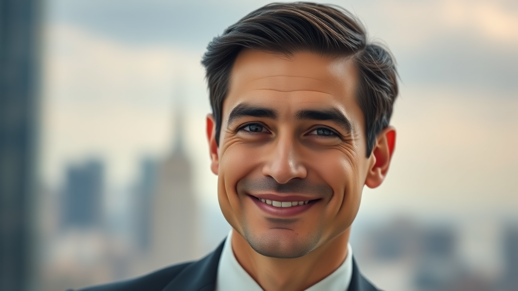 A hyper-realistic headshot of a man gazing into the camera with a soft, confident smile, exuding a sense of calm and professionalism, with neatly styled dark hair, wearing a sharp, tailored suit, against a subtle, blurred cityscape background suggesting the corporate world, capturing the essence of a successful and approachable advertising executive with a slight artistic flair.