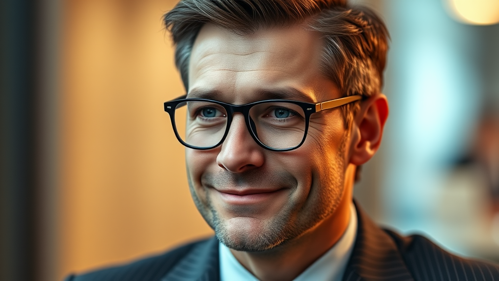 A hyper-realistic headshot of a man with a slight smile, exuding calm and confidence, with neatly styled hair and sharp, stylish glasses, wearing a tailored suit with a subtle pinstripe pattern, a soft-focus background providing a warm, professional ambiance, capturing the essence of a visionary advertising executive.
