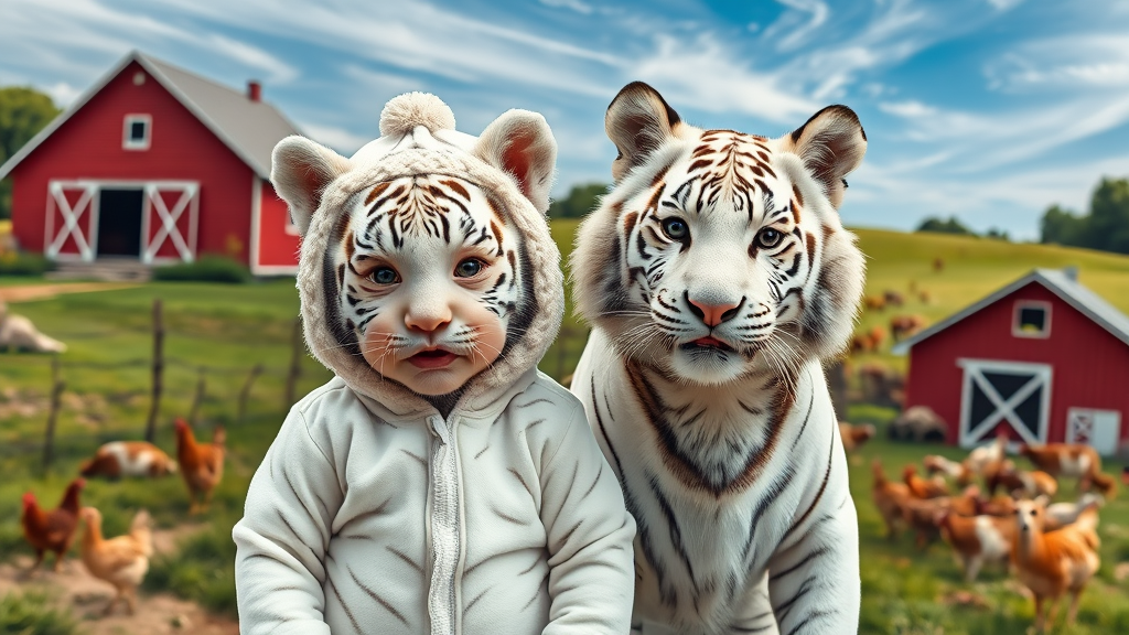 A hyper-realistic, high-definition image depicts a baby and a white tiger standing side by side, both gazing directly at the camera with friendly expressions. The baby, dressed in a soft, fluffy white outfit adorned with matching tiger stripes, wears a cute hat with miniature tiger ears, enhancing their adorable appearance. The white tiger's fur pattern mirrors the design of the baby's outfit, creating a harmonious visual connection. Both subjects are similar in size, highlighting an enchanting sense of camaraderie between them. They are situated on a vibrant farm, with a rich background revealing lush green pastures, a classic red barn, and a multitude of farm animals like chickens and cows in the distance, with a cobalt blue sky and wispy clouds overhead. The scene captures intricate details, such as the texture of the tiger's fur and the softness of the baby's outfit, emphasizing the lifelike quality and charm of the composition.