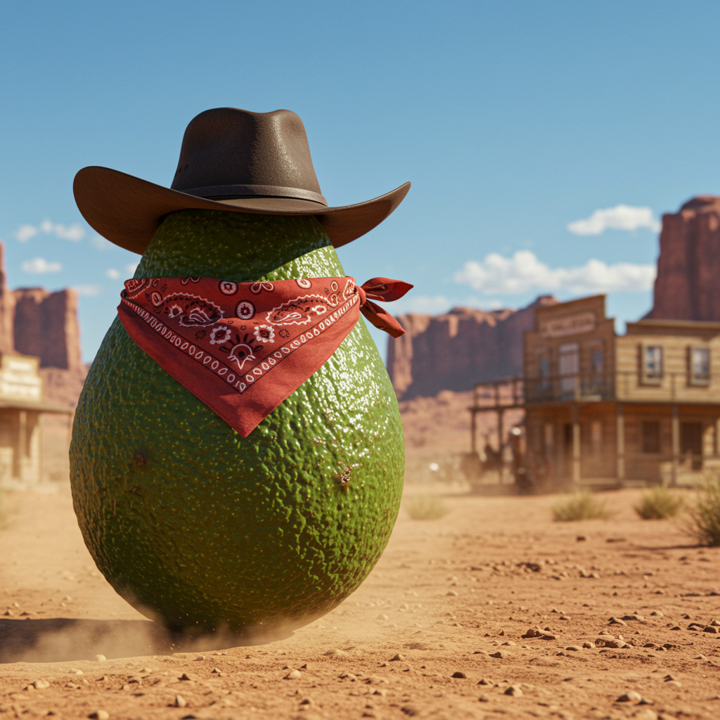 A hyper-realistic, highly detailed 8k movie still captures an avocado desperado in the wild west. The scene is set in a dusty, sun-baked frontier town with rolling tumbleweeds and a saloon in the background. The avocado wears a classic cowboy hat tilted jauntily, with a bandana tied around its stem. Its textured skin glistens in the sunlight, giving it a rugged, weathered appearance. In the distance, sandstone mesas rise sharply against a brilliant azure sky, adding depth and drama to the backdrop. The composition captures the tension of a showdown, with shadows cast dramatically across the scene.