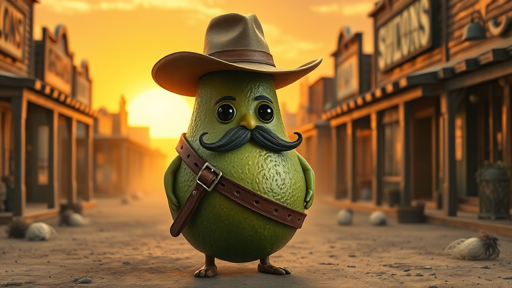 A hyper-realistic, highly detailed 8k scene features an anthropomorphic avocado dressed as a desperado, complete with a wide-brimmed hat and a bandolier across its textured green surface, standing confidently in a wild west town. The sun sets in the background, casting long shadows and a warm golden hue over the dust-covered street. Wooden saloons and scattered tumbleweeds frame the scene, enhancing the authentic western atmosphere, while a subtle breeze animates the avocado's tiny, leafy mustache.