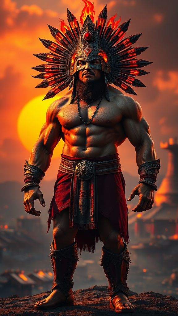 A hyper-realistic, highly detailed depiction of a 35-year-old muscular, brutal-looking male set against the backdrop of a burning city at sunset. The scene is illuminated with dramatic lighting, casting deep shadows and highlighting his finely detailed head, face, torso, arms, hands, legs, and feet. He stands, exuding a savage and dark aesthetic, embodying an ancient era theme. His epic attire is enhanced by vibrant colors that complement the orange, red, and turquoise hues of the setting sun. The focal point is his majestic headdress, ablaze with fiery elements, crafted from massive, powerful-looking components. The overall color palette is extremely vibrant, with tones carefully chosen to enhance the sunset ambiance and create a visually striking and unforgettable image.