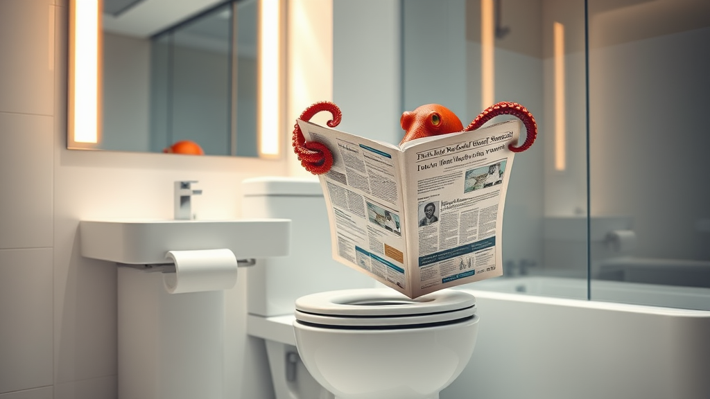 A hyper-realistic, highly detailed image of a red octopus with one tentacle elegantly holding a newspaper, sitting on a pristine white toilet. The scene is set in a bright, white-toned bathroom, with a mirrored wall behind reflecting soft, glowing LED lights that cast a warm, cinematic ambiance. The entire composition excludes any dark tones, focusing instead on the clarity and subtle warmth of the space, ensuring a clean, sophisticated aesthetic. The octopus appears naturally integrated into the setting, with each intricate detail of its skin and the glossy paper of the newspaper contributing to the photorealistic quality of the image.