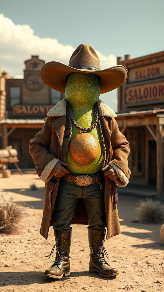 A hyper-realistic, highly detailed movie still depicting an avocado-shaped desperado standing confidently in a wild west scene, dressed in traditional cowboy attire complete with a wide-brimmed hat, leather boots, and a sherpa-lined duster coat. The dusty town backdrop features a saloon and tumbleweeds drifting in the background, creating a sense of the rugged frontier. The avocado desperado's skin is textured with natural avocado patterns, and its pit is humorously visible through an open shirt. Sunlight casts dramatic shadows, enhancing the 8k photographic quality of the scene.