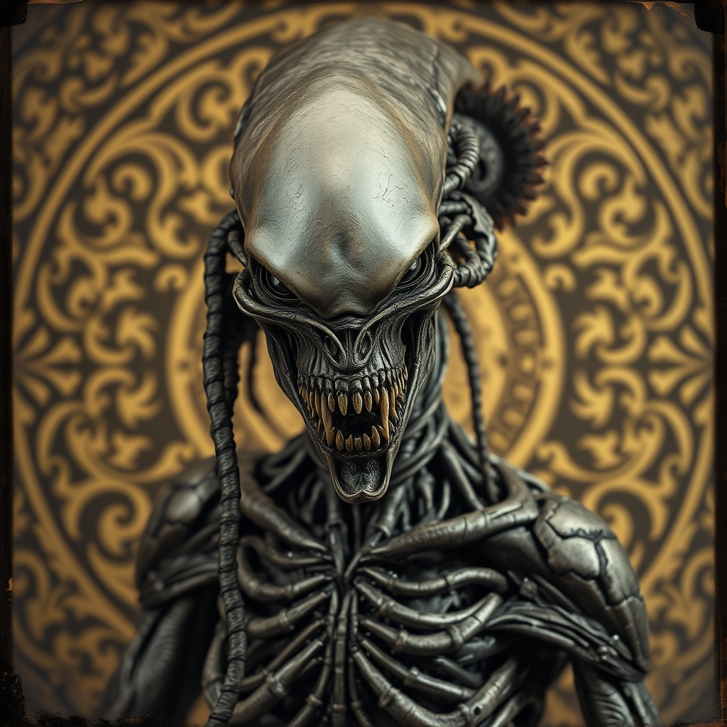 A hyper-realistic, highly detailed portrait of a zombie xenomorph warrior, captured in the style of a wet plate collodion photograph reminiscent of Mathew Brady. This character exudes an eerie blend of horror and intrigue, with influences from artists Stefan Gesell, Emil Melmoth, H.R. Giger, and Gustav Klimt. The warrior's grotesque yet captivating features have intricate biomechanical elements, set against an ornate background inspired by Klimt's gilded patterns. The sharp, meticulously detailed textures highlight the creature's sinewy muscles and alien exoskeleton, while its hollow eyes and gaping maw hint at a haunting, undead vitality. This dark and mesmerizing figure stands as a testament to the macabre beauty found at the intersection of art and nightmare.