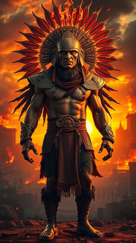 A hyper-realistic, hyper-detailed depiction of a 35-year-old man with a savage and dark aesthetic, including a highly detailed head, face, torso, arms, hands, legs, and feet in a full-body composition. The scene is set against a burning city as the sun sets, casting warm and vibrant colors that complement shades of orange, red, and turquoise. This ancient-era male figure is muscular and brutal, exuding a fierce and commanding presence. He wears an epic ensemble, highlighted by a majestic headdress made of intricately designed elements that appear to be on fire. The headdress is massive and ornate, adding to the dramatic aura of the scene. The color palette is vibrant and intense, accented with complementary sunset hues, evoking a sense of majesty and power.