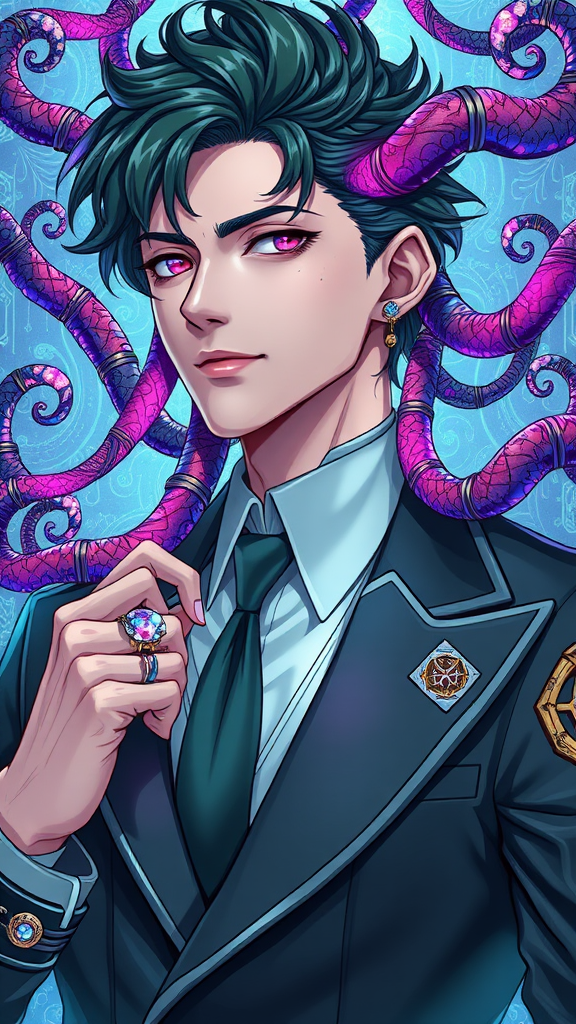 A hyper-realistic illustration of a male anime character with a retro-futuristic edge, blending organic giygas-inspired tendrils with the elegance of a forest druid. The character is a cyborg dressed in a sharp business suit, integrating technological rings and intricate, filigree scrollwork. Created in the styles of Ayami Kojima and influenced by artists James McCarthy, Beeple, and Johfra Bosschart, this piece showcases a masterpiece level of detail. The scene is rendered using Unreal Engine and Octane, featuring elements of vibrant iridescence and abstract nouveau design. Concepts by Tooth Wu, WLOP, Beeple, and Dan Mumford enhance the depth of the artwork. A symmetrical, cinematic, and key art piece, reminiscent of Albedo from Overlord, with influences from The Library of Gems. This trending Artstation piece by Greg Rutkowski captures hyper realism at 8K resolution, with a focus on highly detailed, coherent, and symmetrical aesthetics.