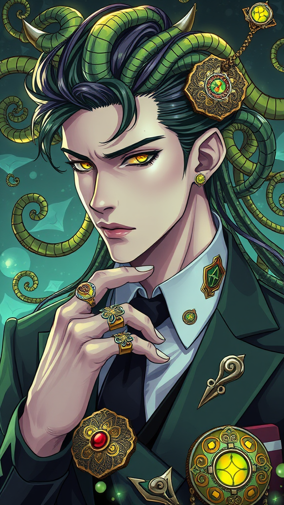A hyper-realistic illustration of a male anime character, intricately detailed with organic tendrils inspired by Giygas, blending the essence of a forest druid with the sleekness of a business suit. The character embodies retro-futuristic elements as a cyborg, featuring sharp, technological rings and intricate designs reminiscent of Ayami Kojima's style. The masterpiece combines influences from artists like James McCarthy, Beeple, and Johfra Bosschart, showcasing a fusion of sharp detail and sculpted composition. The artwork is further enriched by nouveau filigree scrollwork and abstract patterns, rendered in an 8K resolution using Unreal Engine and Octane Render technologies. It presents an iridescent finish, echoing the aesthetics of Albedo from Overlord and The Library of Gems. The piece stands out on platforms like ArtStation, displaying a coherent and symmetrical balance, with creative touches from Tooth Wu, WLOP, Beeple, and Dan Mumford. The cinematic quality and key art appeal mark it as a highly realistic and vivid piece, ideal for concept art enthusiasts.