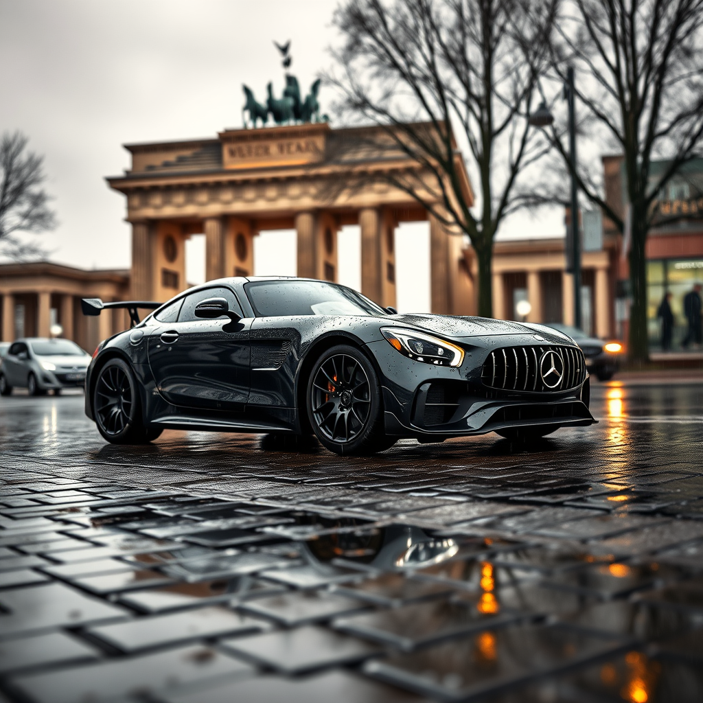 A hyper-realistic illustration of a sleek Black Mercedes Benz AMG GTR parked on a cobblestone street in Berlin, Germany. The cityscape is enveloped in the moody ambiance of a rainy afternoon, with droplets glistening like tiny jewels on the car's polished surface. The iconic Brandenburg Gate stands subtly blurred in the background, adding an authentic touch to the scene. Reflections from puddles on the ground create a dynamic play of light and shadow, highlighting the car's aerodynamic curves. The sky is overcast, casting a soft, diffused light that enhances the depth of detail, with the scene rendered in ultra detailed 8K resolution, HDR quality, and Octane Render, capturing every nuance of the wet surfaces and the carβs glossy finish, set in a widescreen aspect ratio.