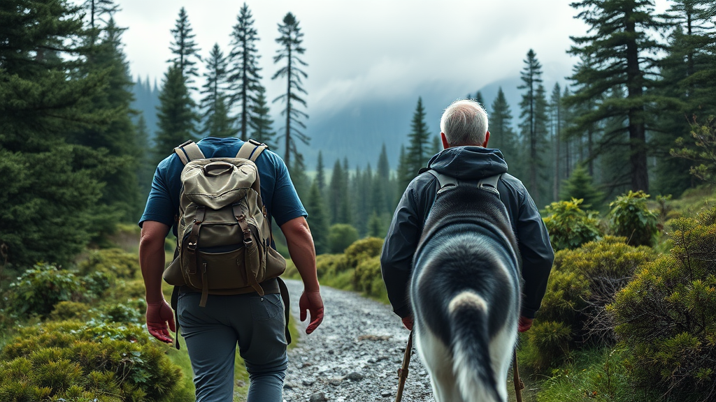 A hyper-realistic image captures a middle-aged man with an average build and short, salt-and-pepper hair, walking confidently alongside a Siberian husky. The man is seen from behind, clad in rugged exploration gear, making his way towards the vast expanse of a majestic Patagonian forest. The natural path underfoot is slightly rugged, surrounded by lush greenery, with towering trees standing proud in the distance. Soft, diffused light filters through the overcast sky, imparting a serene yet adventurous ambiance. The Husky, alert and attentive, has its fur subtly highlighted by the gentle natural light. This scene showcases the untouched wilderness and dramatic landscapes of Patagonia, capturing the essence of exploration and the raw beauty of nature. Every element is hyper-detailed, from the textures on the manβs clothing and the dog's fur to the intricate details of the forest, all bathed in realistic color tones and cinematic composition.