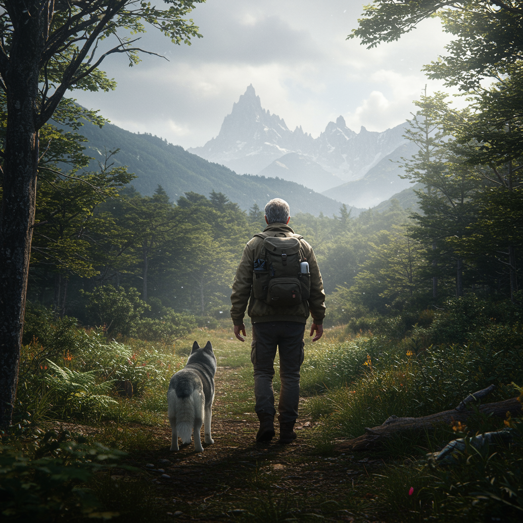 A hyper-realistic image captures a middle-aged man with an average build and short, salt-and-pepper hair, walking confidently with a Siberian husky by his side. The man, seen from behind, is dressed in rugged exploration gear, suggesting a seasoned adventurer, as he strides towards a breathtaking and expansive Patagonian forest. The natural path beneath his feet is slightly rugged, weaving through lush greenery. Towering trees loom majestically in the distance, while diffused light filters through the overcast sky, casting a serene glow on the scene. The husky, alert and poised, stands out with its fur gently illuminated by the soft natural light, emphasizing its keen awareness of the surroundings. The landscape beautifully showcases Patagonia's raw, untouched wilderness and dramatic scenery, invoking a spirit of exploration. The textures in the man's clothing, the dog's fur, and the surrounding nature are rendered with exquisite detail, offering a cinematic composition with realistic color tones.