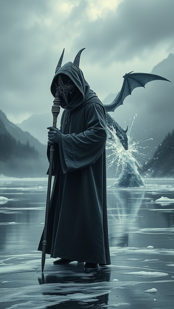 A hyper-realistic image captures a mysterious robed wizard with a round hood standing on a frozen lake, gripping an ornate staff that radiates magical energy. The scene is set in a moody atmosphere reminiscent of epic fantasy, as a majestic water dragon bursts through the ice, sending shards flying in all directions. The environment features misty mountains and a brooding, overcast sky, creating a somber yet intensely magical moment. The muted color palette enhances the mystical and dramatic tone, with subtle variations added for artistic flair, while maintaining the scene's epic and enchanting essence.