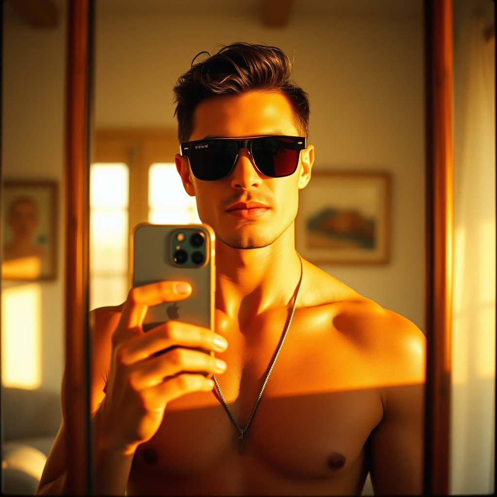 A hyper-realistic image captures a striking man in stylish beachwear, sporting sleek sunglasses. He stands in front of a mirror, holding an iPhone 14, reflecting his short dark hair against a cozy, sunlit room. The warm glow of golden hour bathes the scene in a nostalgic film grain akin to Kodak Portra 800, with a soft blur from an f1.8 aperture enhancing the intimate and relaxed ambiance. The composition is elegantly framed in a 2:3 aspect ratio, subtly highlighting the man's confident yet relaxed demeanor against the bright, inviting background.