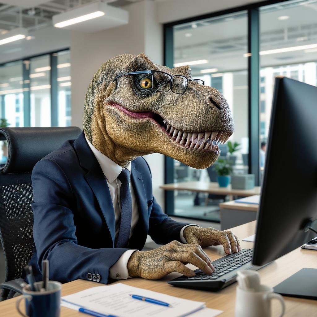 A hyper-realistic image captures a T-Rex immersed in a vibrant, modern office setting, typing away on a sleek computer. The dinosaur is dressed in an impeccably tailored suit, complete with a stylish tie and fashionable glasses perched on its snout. The environment is expansive and well-lit, showcasing a wide angle perspective that highlights the T-Rex's full body, emphasizing the juxtaposition of its prehistoric features against the contemporary workspace. The scene is rendered in stunning 8k high definition, adding depth and clarity to this imaginative blend of eras.