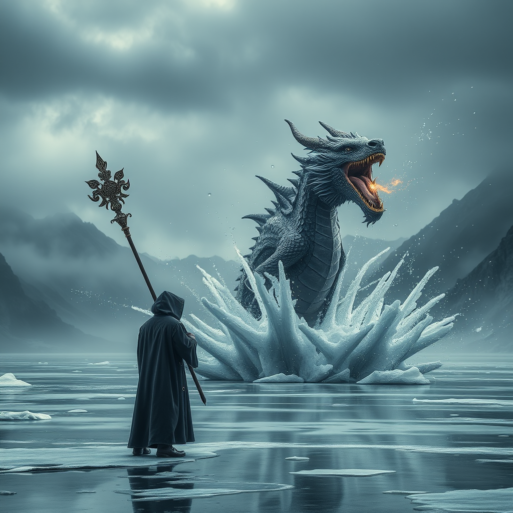 A hyper-realistic image capturing a dramatic scene where a robed wizard with a round hood stands majestically on a frozen lake, grasping a large, ornate staff that radiates powerful magical energy. The moody atmosphere is palpable as a magnificent water dragon bursts through the ice, sending shards flying through the air. The dragon's emergence is epic, displaying fine details and intricate textures as water droplets glisten around it. In the background, misty mountains loom under a brooding sky, casting a somber yet awe-inspiring ambiance. Despite the muted color palette, the image vibrates with the intense magic of the moment, blending mystery and grandeur seamlessly. The scene, free from any visual imperfections, captures the breathtaking collision of magical forces and nature's fury.