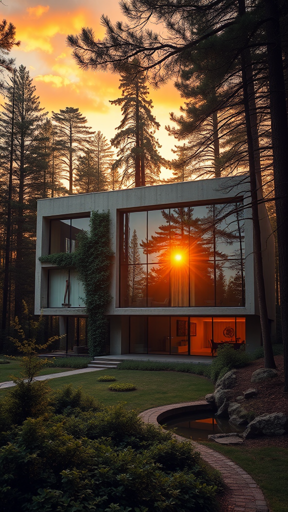 A hyper-realistic image depicting a house with a brutalist architectural style, featuring walls mostly made of expansive windows. This unique structure is nestled in the heart of a dense forest during the golden hour of sunset. The photograph emphasizes the brutalism characteristics of raw concrete and sharp geometric forms, juxtaposed against the extensive glass surfaces. The setting sun bathes the scene in a soft, golden light, accentuating the house's bold design amidst the lush greenery and towering trees. The composition harmonizes the stark lines of brutalism with the gentle, flowing contours of the natural forest environment, adding ivy creeping up one corner of the structure and a small water feature nearby reflecting the colorful sky.