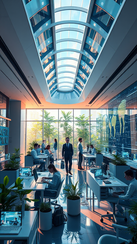 A hyper-realistic image depicting the future of work, featuring a sleek, ultramodern office space filled with transparent holographic displays and advanced AI-driven tools. Volumetric lighting bathes the room in a warm, ethereal glow, casting soft shadows that highlight the intricate details of ergonomic furniture and plant-integrated workstations. Diverse professionals collaborate seamlessly, some wearing augmented reality glasses, others using voice-activated systems, all immersed in a tech-driven efficiency. The ceiling is a massive skylight, flooding the interior with natural light and a view of vertical green gardens outside. Chaos in the underlying design hints at controlled creative energy, with vibrant digital art subtly integrated into the environment, creating a harmonious balance between innovation and comfort.