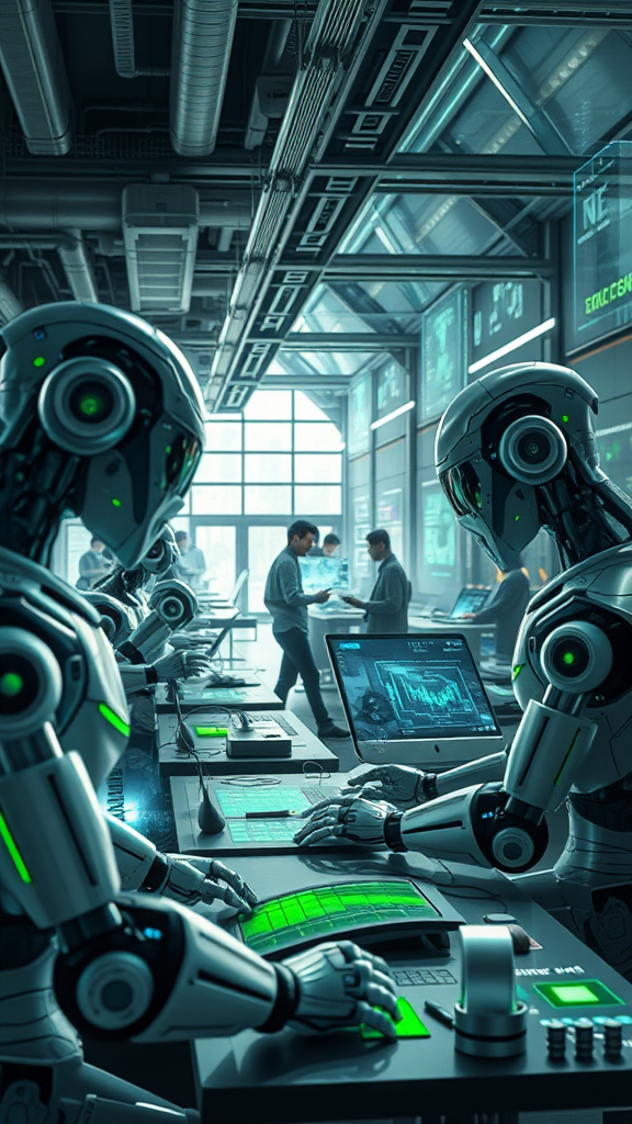A hyper-realistic image depicting the future of work, showcasing an advanced office environment filled with futuristic technology. Volumetric lighting casts dynamic shadows across sleek, innovative workstations and holographic displays. Intricate details highlight the seamless interplay of humans and AI-driven robots collaborating on creative projects. The scene is alive with energy, capturing a sense of organized chaos with teams engaged in brainstorming sessions. The workspace is open and airy, with green eco-friendly elements integrated throughout, emphasizing sustainability. The atmosphere blends the digital with the natural, creating a balanced, productive environment.