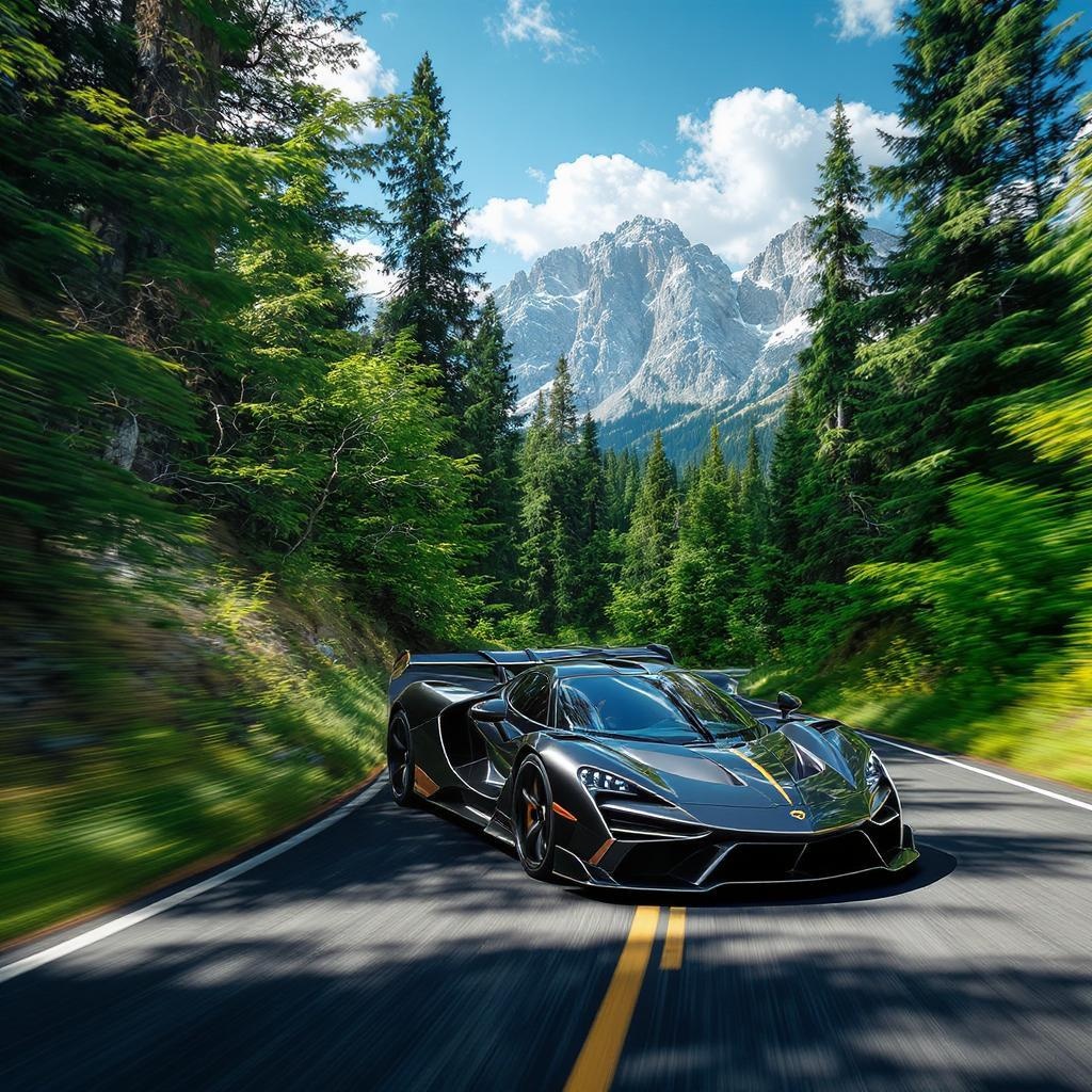 A hyper-realistic image of a cutting-edge hypercar gliding down a winding forest road, surrounded by lush greenery, with majestic mountains towering in the background. The scene is captured in vivid 8K resolution, showcasing vibrant colors and intricate details, from the gleaming curves of the car to the texture of the forest floor. The sky is a brilliant azure, punctuated by wisps of clouds, casting dynamic shadows on the road. The essence is one of harmony between man-made marvel and untouched nature, a serene yet exhilarating depiction of speed meeting serenity.