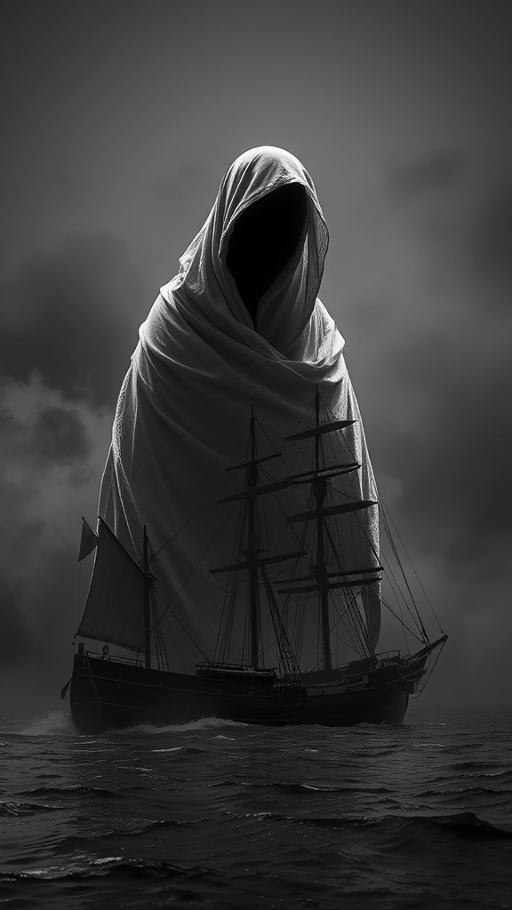 A hyper-realistic image of a person wrapped in a shroud-like material, seemingly merging with the surrounding air. The scene captures a striking contrast between a darkened background and the luminous, radiant texture of the fabric, evoking a sense of emergence or transformation. The monochrome shades enhance the mysterious and intense atmosphere. In the foreground, a masterfully detailed ultra-realistic sailing ship with cinematic lighting glides under the pale glow of a sunrise. The ship's weathered exterior suggests a long journey, and the low angle adds grandeur to its presence. Executed in a style reminiscent of Studio Ghibli's intricate art and the detailed mastery of John William Turner, the image conveys both serenity and drama.