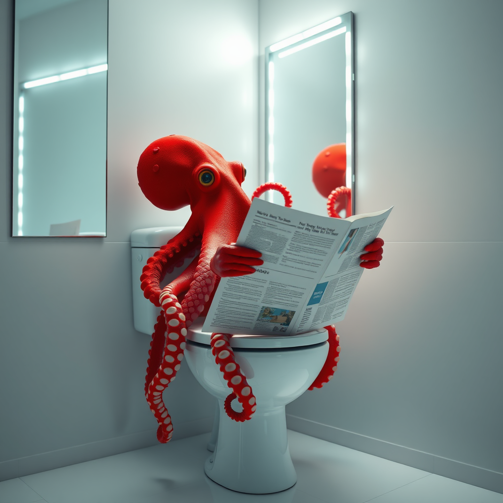 A hyper-realistic image of a red octopus sitting on a toilet, intently reading a newspaper, surrounded by white tones and glowing LED lights. The setting includes a pristine white wall and a mirror reflecting the serene scene, creating a cinematic atmosphere with its highly detailed, photo-realistic aesthetic. The entire composition is bathed in soft white lights, emphasizing the vibrant color of the octopus while maintaining a bright and airy feel. The image avoids any dark tones, presenting a striking contrast against the glowing light and the octopus's deep red hue.