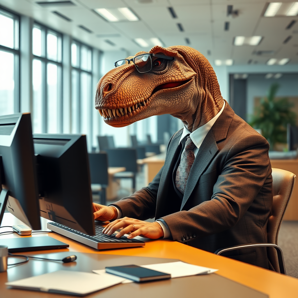 A hyper-realistic image of a T-Rex in a spacious, brightly lit office, fully engaged at a computer, adorned in a tailored suit complete with a tie and polished glasses. The setting captures the T-Rex's full body in a wide-angle shot, emphasizing its unlikely presence in a modern workspace. The environment is detailed in striking 8k resolution, showcasing a juxtaposition of prehistoric and contemporary elements, as the dinosaur meticulously types, surrounded by sleek office furniture and cutting-edge technology, conveying a quirky yet professional vibe.