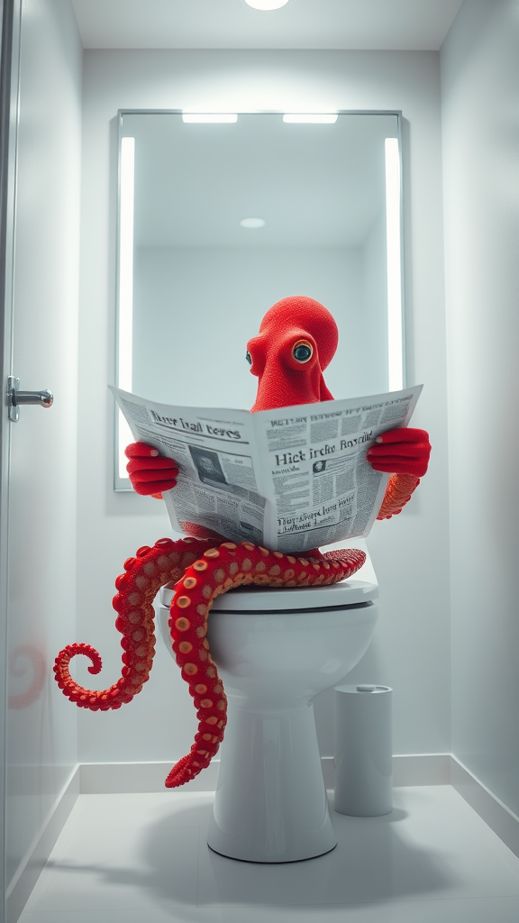 A hyper-realistic image of a vibrant red octopus sitting on a toilet, reading a newspaper in a bright, white-toned room. The walls are pristine white, with a large mirror reflecting the scene, casting a glow enhanced by LED lights. The ambient lighting is cinematic, emphasizing highly detailed textures and maintaining an overall bright and airy feel. The octopus appears intensely focused on the newspaper, adding a whimsical touch to the scene. The entire composition avoids dark tones, encapsulating a serene, luminous atmosphere.