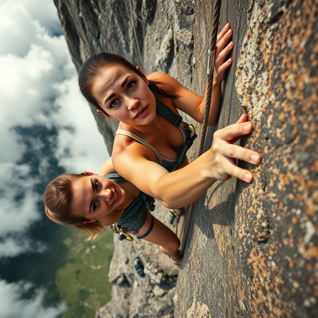 A hyper-realistic image of a woman rock climbing from a dramatic top-down perspective emphasizes the dizzying height of her intense ascent. The scene captures her clinging to the rough, weathered cliff face, her muscles visibly engaged and her fingers delicately probing for the next hold. Her climbing gear stands out in vivid contrast against the natural texture of the stone, with a secure harness, bright carabiners, and quickdraws glinting in the sunlight. Her expression reveals a mix of intense focus and concern, her eyes scanning the surface for a path. The angle reveals swirling clouds in the backdrop and a hint of a lush valley far below, adding depth to the thrilling scene. The cliff has a unique pattern, with veins of quartz running through the rugged rock face, adding an artistic element to the natural landscape.