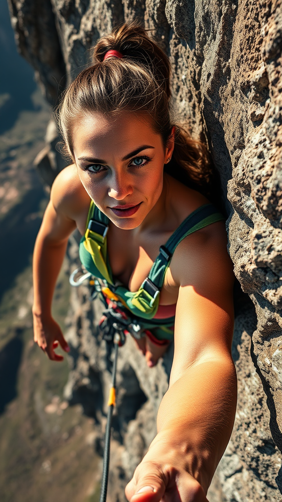 A hyper-realistic image of a woman rock climbing from a top-down perspective, emphasizing the dizzying height and her challenging ascent. She clings to the jagged cliff face, her muscles defined and fingers stretching to find the next hold. Her climbing gear, including a colorful harness with carabiners and quickdraws, creates a vivid contrast against the earthy, textured rock. The sun casts contrasting shadows across the stone, highlighting her determination. Her face is a portrait of intense focus with beads of sweat tracing her brow, reflecting both the rigors and exhilaration of the climb. A distant view of the valley below adds an element of depth and adventure.
